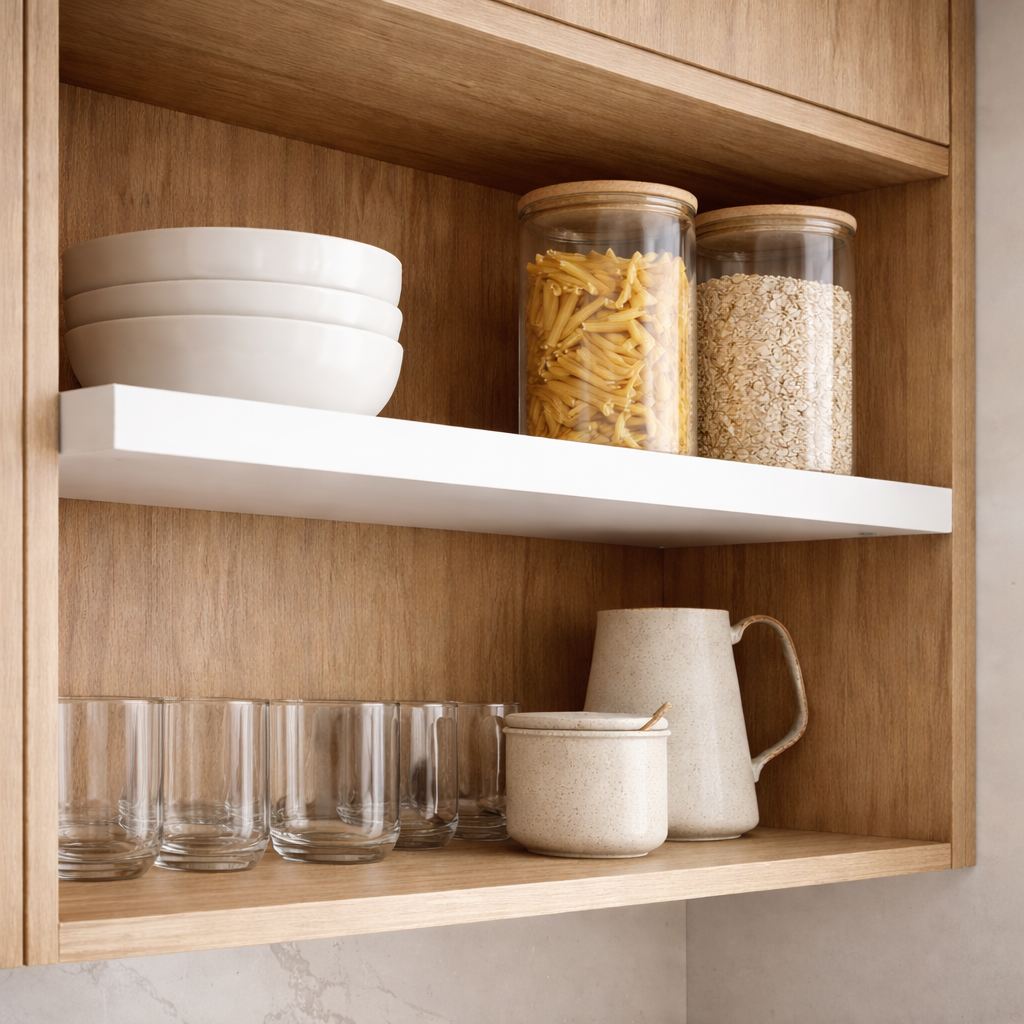 Este produto foi desenvolvido para quem precisa ganhar espaço, organizar melhor e adaptar o armário à sua rotina, sem a necessidade de trocar todo o móvel. A prateleira branca em destaque é perfeita para criar contraste visual e facilitar a visualização dos itens armazenados, especialmente em módulos inferiores, como balcões de cozinha e armários sob pia.